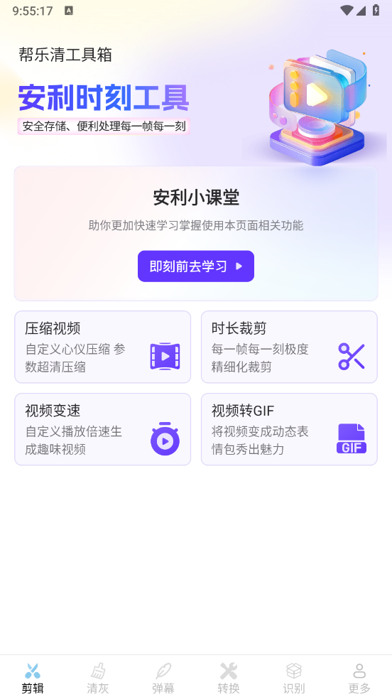帮乐清工具箱集多种实用功能于一体的工具箱,这个万能小工具拥有20+种日常必备功能,比如手机清灰、视频剪辑、弹幕制作、文件解压等,全部免费一键打开就能使用,无需下载安装,界面清爽简单,特别适合手机内存告急的朋友。可以让用户清除手机灰尘更便利,从而让手机的零部件更加清晰。