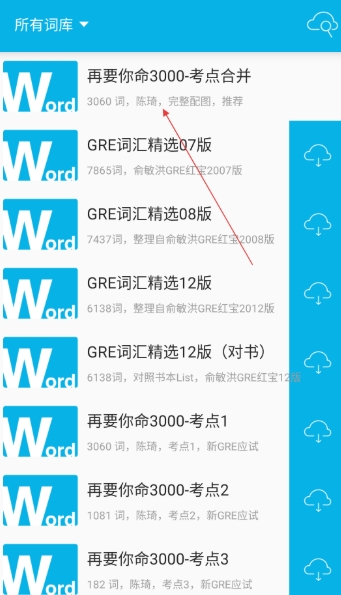 2、在词库选择页面点击【再要你命3000考点合并】选项进入单词学习界面