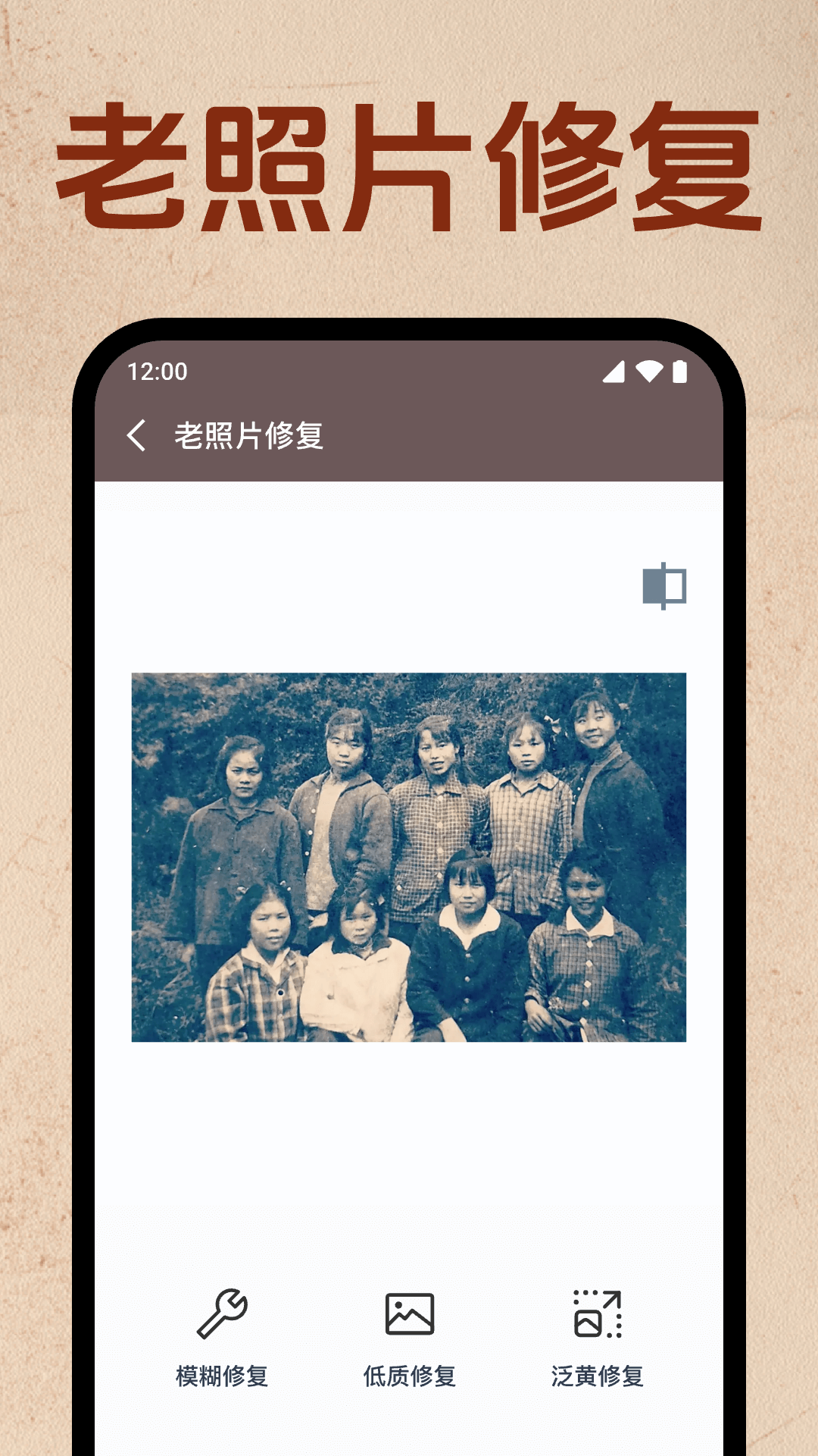照片修复恢复App是专注于照片修复的手机软件,App支持老照片修复、模糊照片、画质增强、黑白照片上色等功能,手机本地的老旧照片全都可以在线进行修复,可以让模糊的照片变清晰、斑驳的照片修复划痕,有需要的用户欢迎下载。